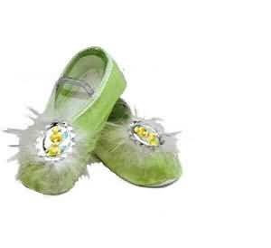 - Disneys Licensed Tinker Bell Ballet Slippers. Plastic Tinkerbell Emblem and with tuft of marabou on toes.